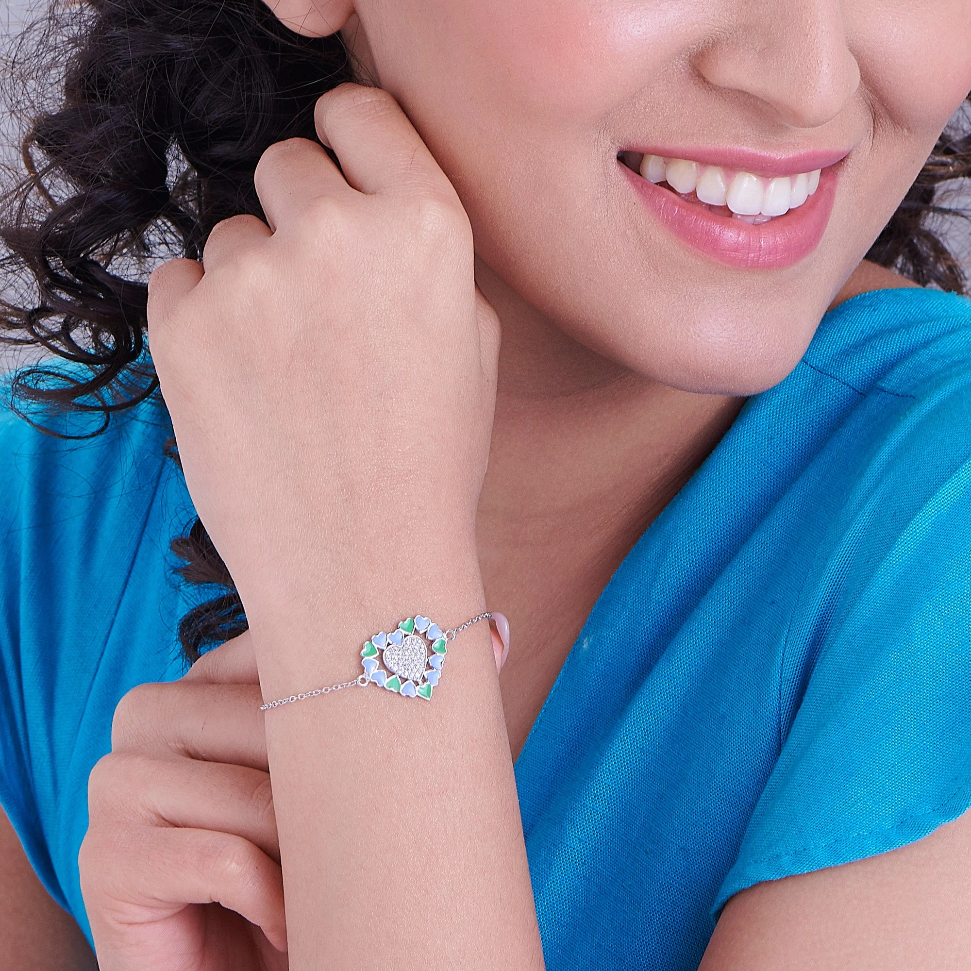 Heart-Shaped Blue-Green Enamel 925 Sterling Silver Bracelet with White CZ Stones